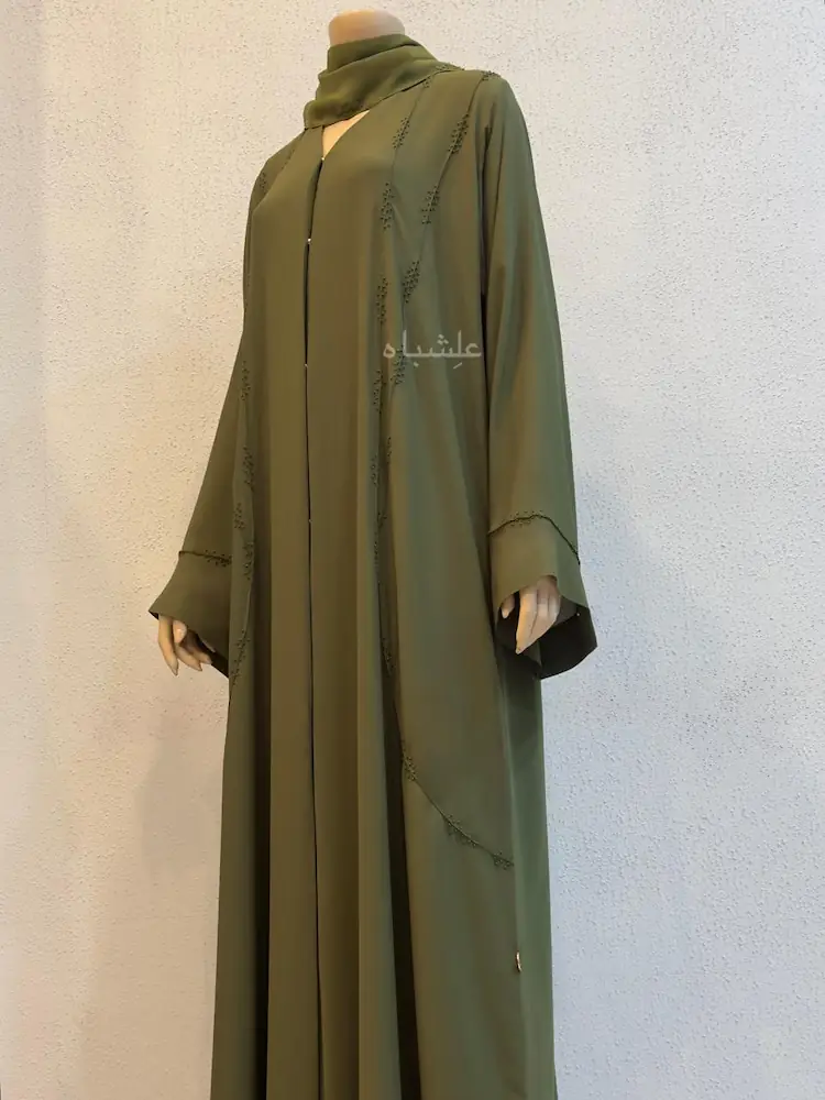 The sleeves have a soft flare, allowing easy arm movement without breaking the fall of the fabric. The front opening sits neatly, making it ideal for layering with inner dresses, travel outfits, or workwear. The sheila adds a finishing touch with the same deep-olive tone, creating a monochrome modest look that feels effortlessly pulled together.