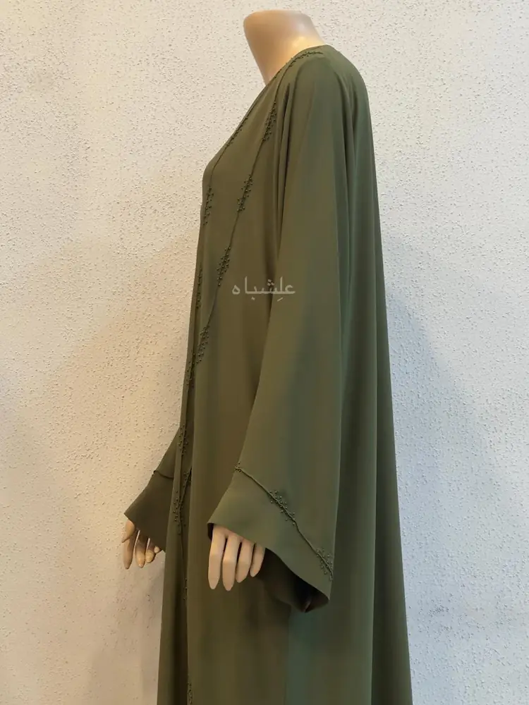 The design of Aayat of Olive Calm is minimal by intention. The silhouette is kept clean to let the colour speak first. When the fabric catches light, it reveals a muted sheen—nothing flashy, everything refined. The beadwork flows in curved lines along the front, sleeves, and side seams. These tiny beads are placed with precision so they complement the abaya rather than overpower it.