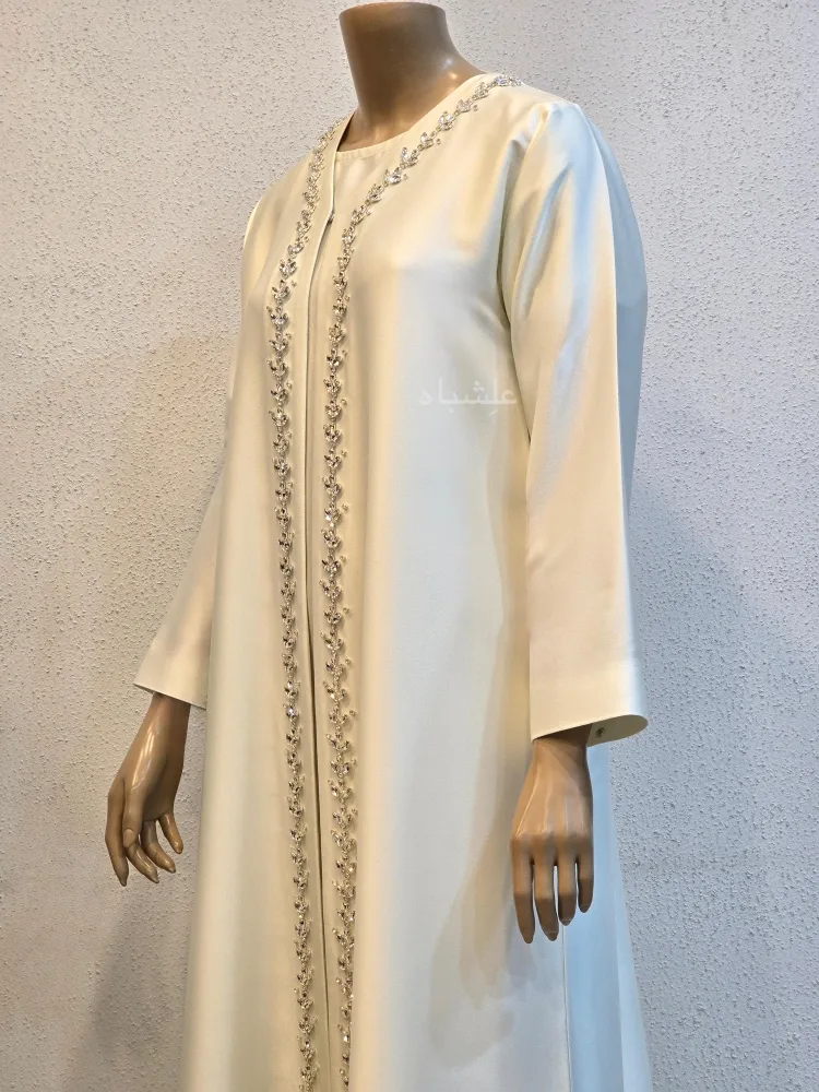 If you’re looking for a modest white abaya with sparkle, Noor al-Kausar is ideal. Its crystal work and soft layering make it perfect for bridal prep, nikah photos, or post-wedding modest wear.