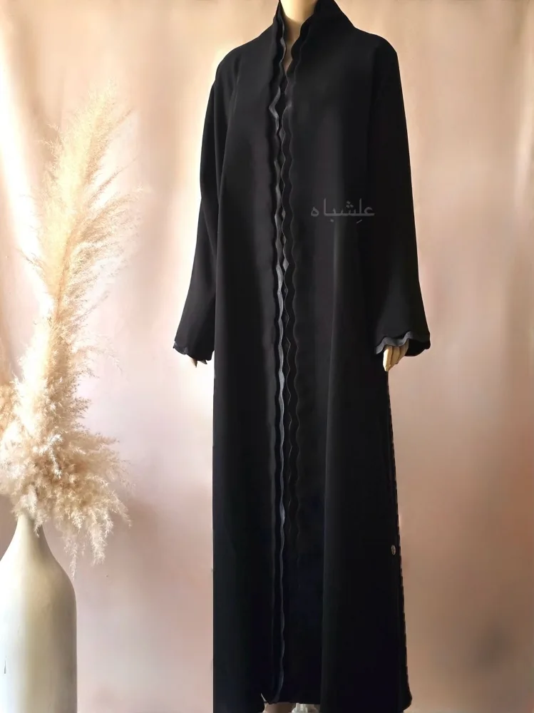 The standout feature of Scallop Noir lies in its scalloped layering. Each sleeve and front panel is shaped with curved edges — lined in a second layer of soft crape satin for contrast and fluidity. The back remains clean, letting the front speak with quiet confidence. The tailored collar adds structure to the open style front, offering a polished yet relaxed silhouette. The sheila, crafted from lightweight chiffon, flows easily for everyday styling. This is a modern abaya designed with full-coverage comfort and hijab-friendly movement.