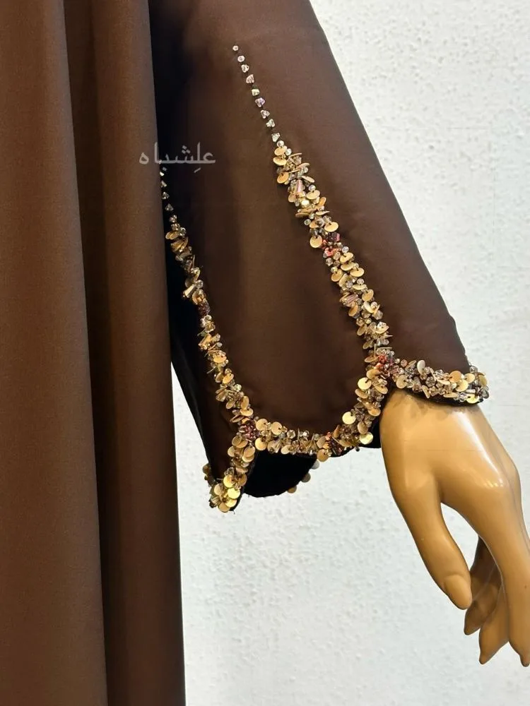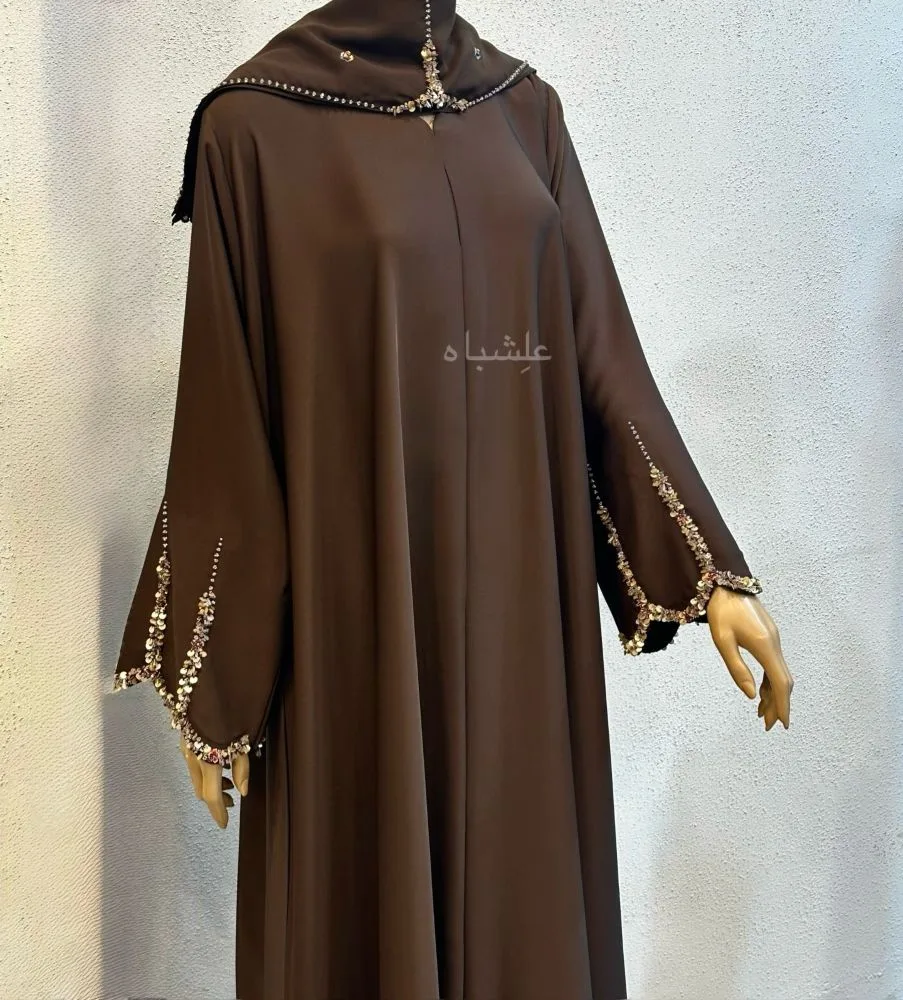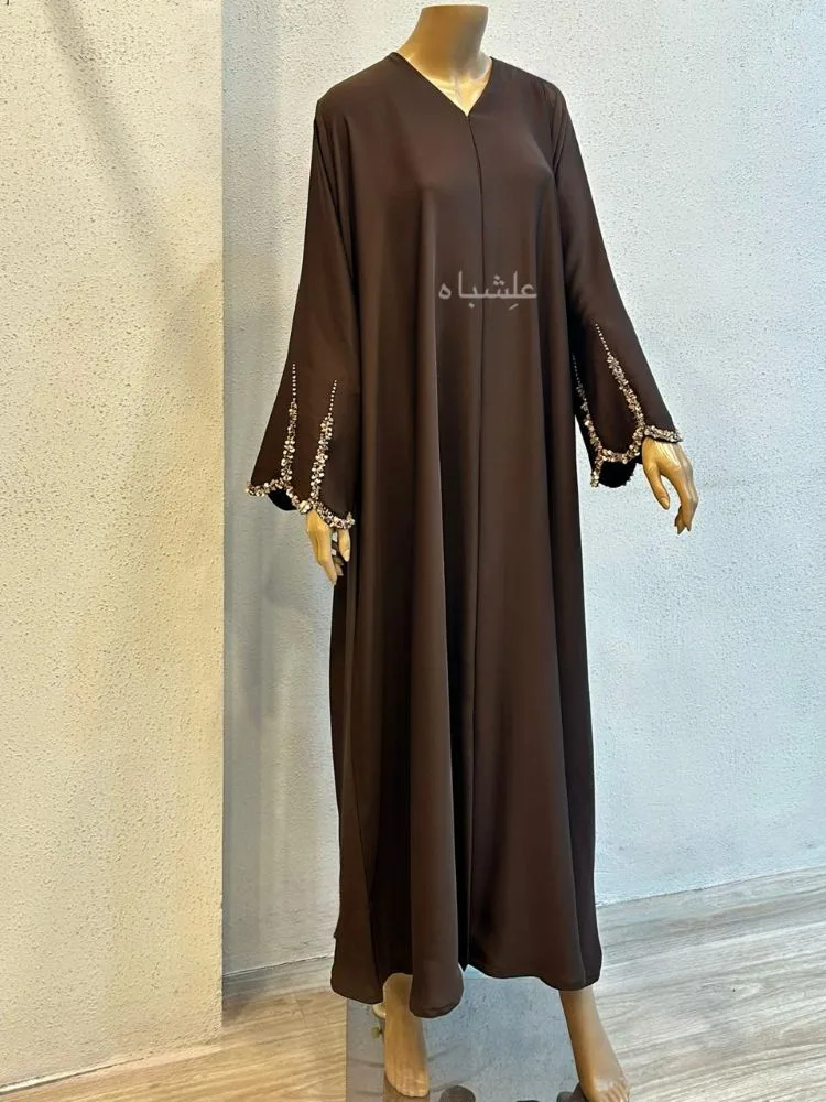 Crafted from soft Nida Premium, this abaya drapes fluidly, catching light in subtle gold reflections along its hand-stoned sleeves. Every bead and crystal tells a story of balance — where glow meets grace.