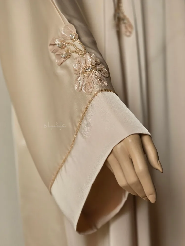 Crafted from Hareer Reem Crape, this abaya offers a smooth, flowy feel that drapes well across all body types. Its handworked front and sleeves feature intricate floral motifs with 3D petals and shimmering thread work made to catch the light just right. This is not just another abaya dress—it’s a wardrobe staple that represents modern abaya designs with traditional inspiration.