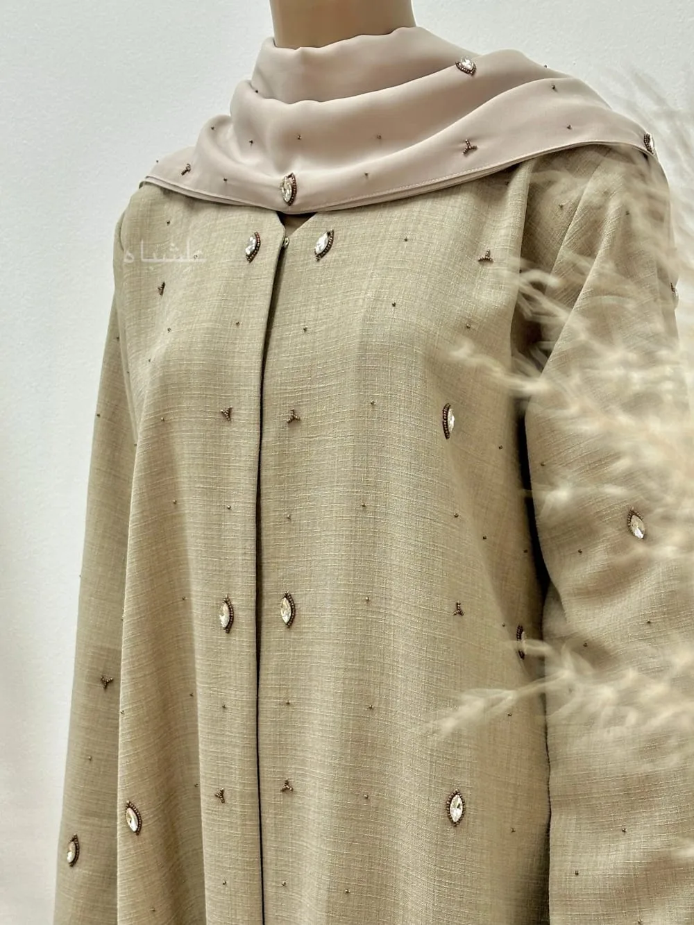 - Intricate Clipstone Handwork: The stunning clipstone handwork adds a unique touch to the abaya. Each motif is designed with care, showcasing the skill of our artisans.