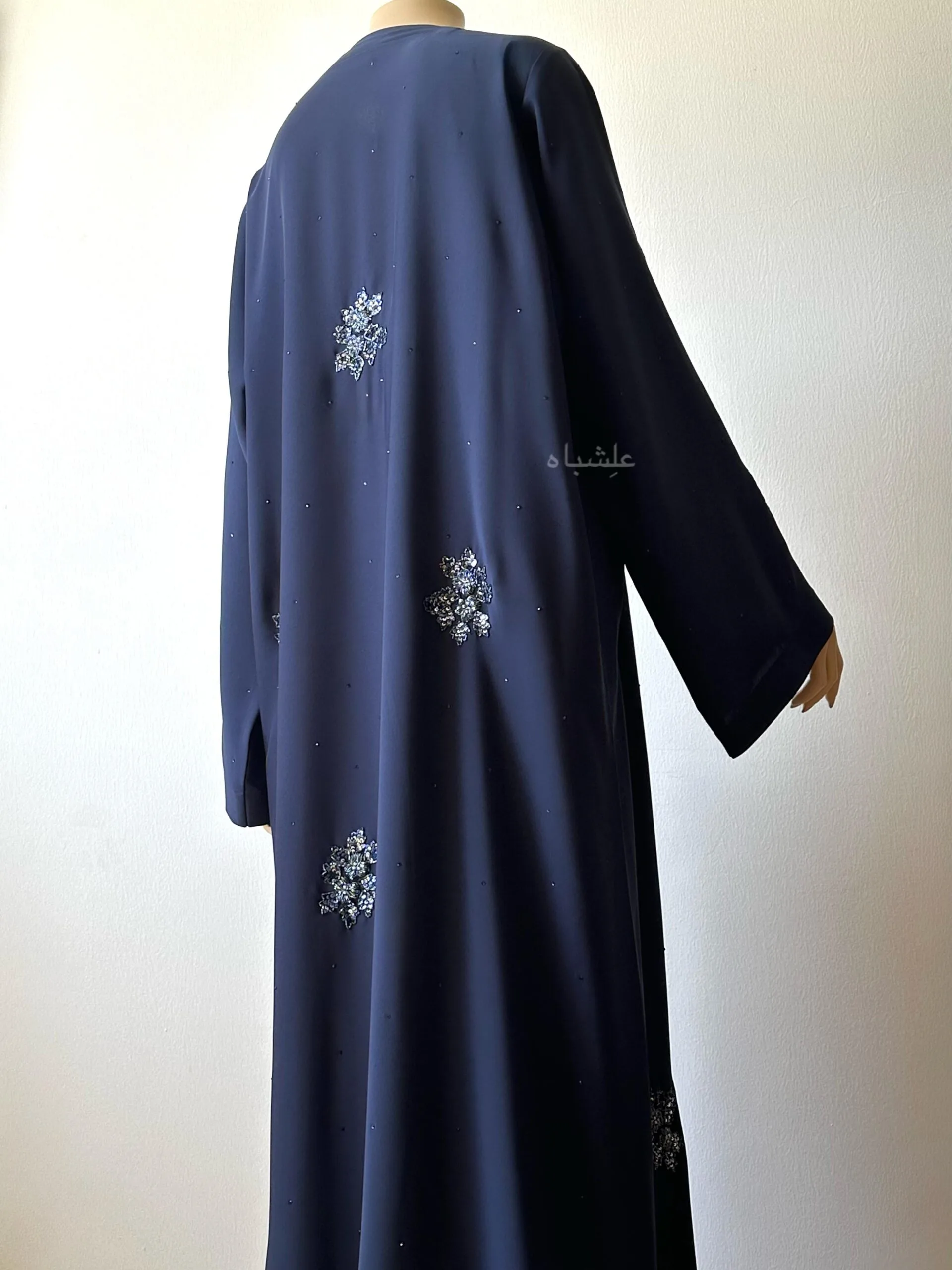 This navy blue abaya doesn’t just look beautiful — it feels meaningful. The snowflake-style handwork creates a stunning texture and highlights the skill behind the design. The rhinestone detailing is subtle, making it shine under light without being too bold. This combination of traditional abaya artistry with small, thoughtful updates makes this one of the best abayas in our collection.