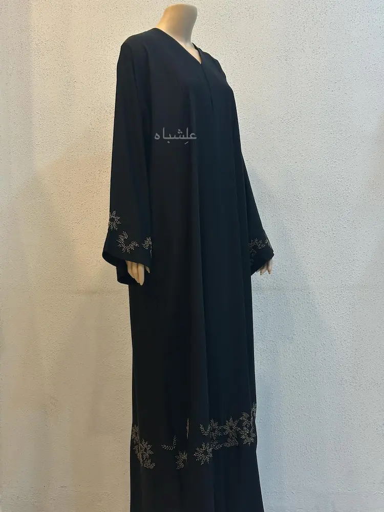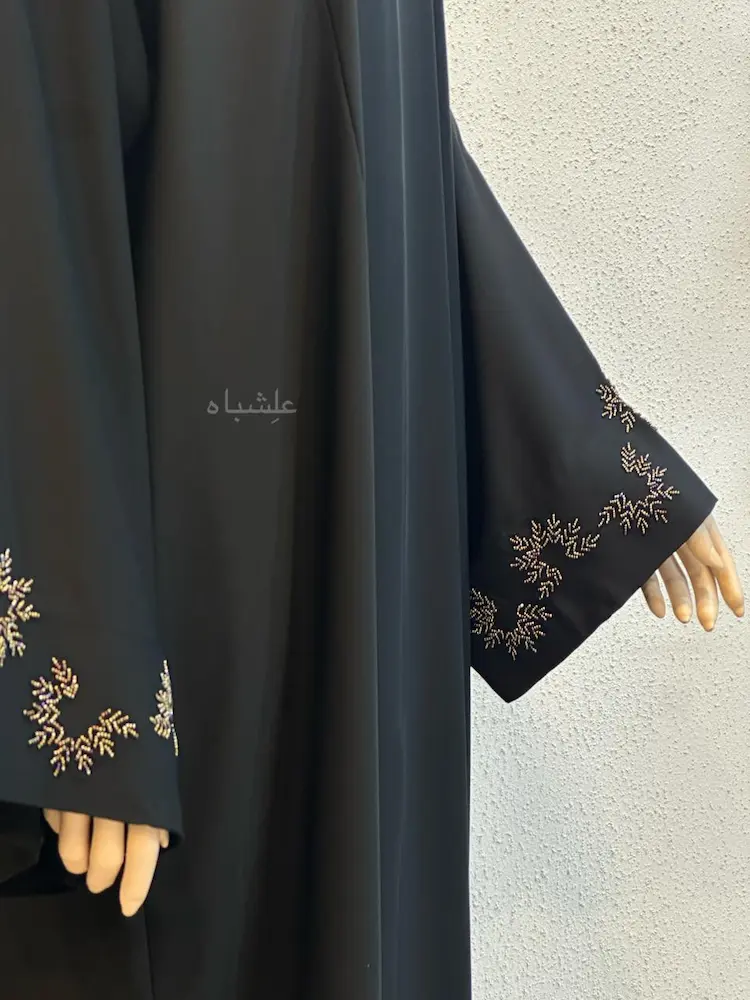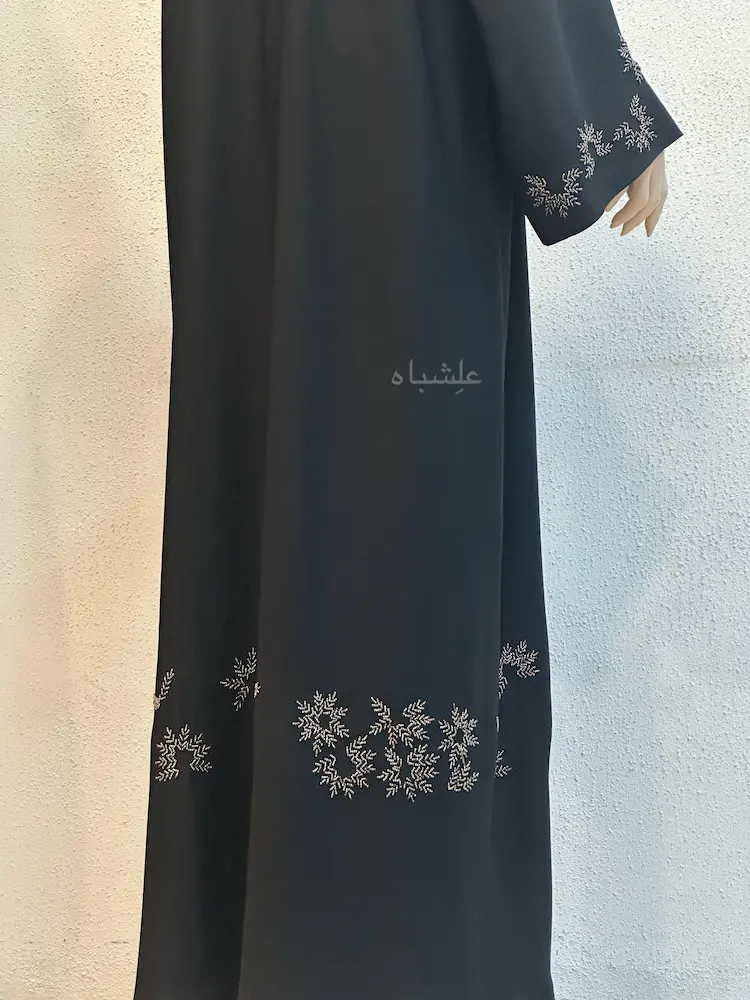 The handwork on the Nazm Al-Fasl Abaya is placed with discipline.