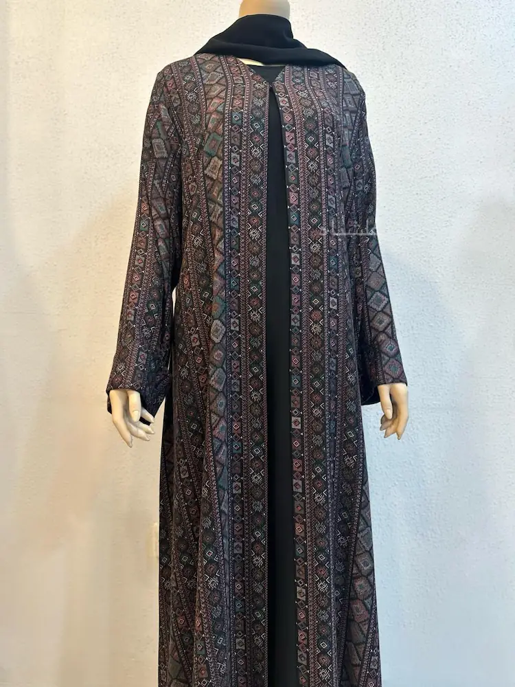 The outer layer features intricate geometric motifs in muted jewel tones, while the Noor fabric inner adds smooth contrast and comfort against the skin. Paired with a matching soft chiffon sheila, this design flows effortlessly from casual outings to evening gatherings.