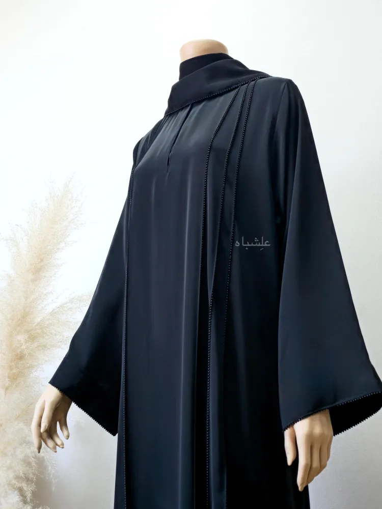 - Matching Sheila: Soft chiffon Sheila (28” width, 88” length) with pearl accents to complete the abaya design.