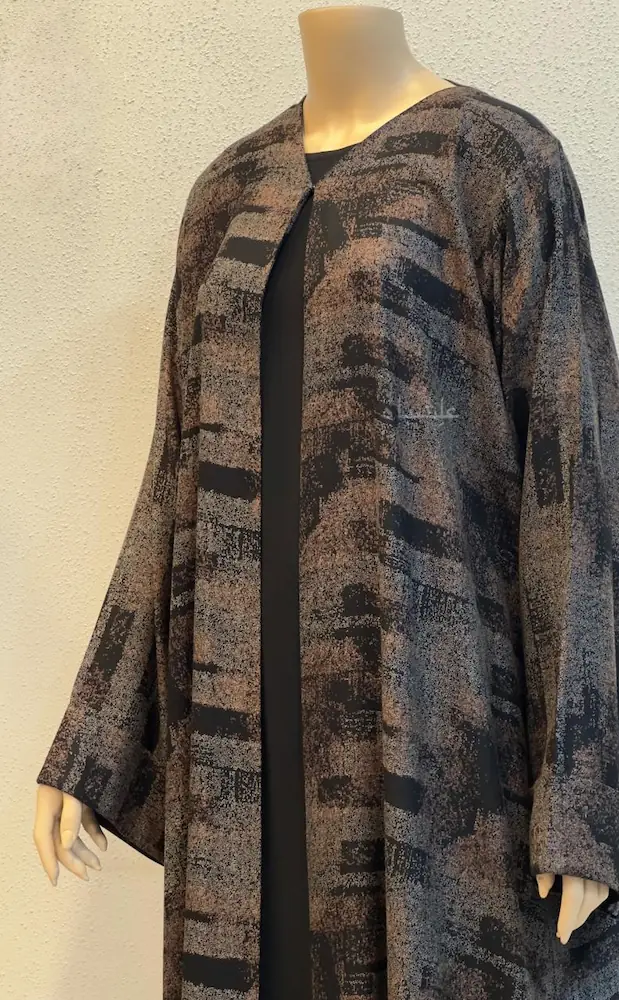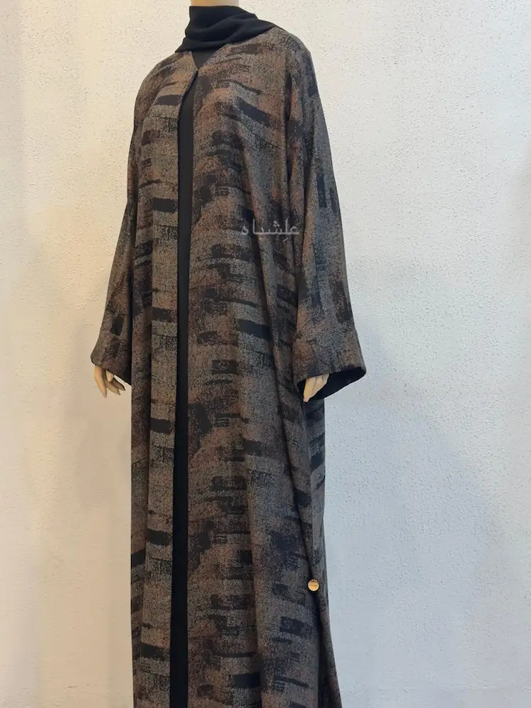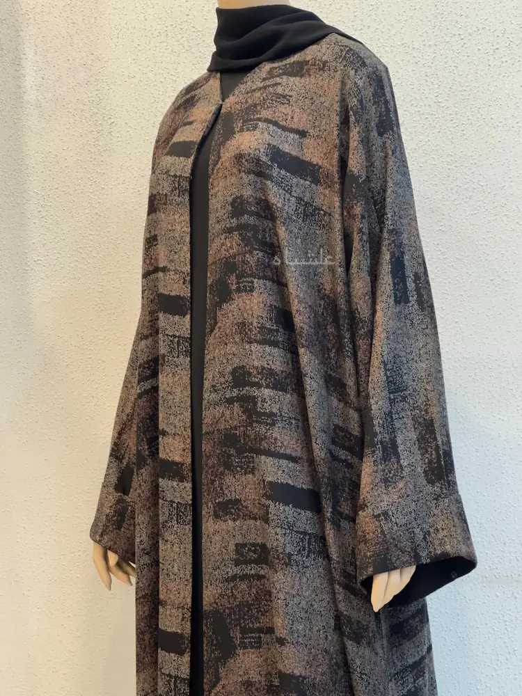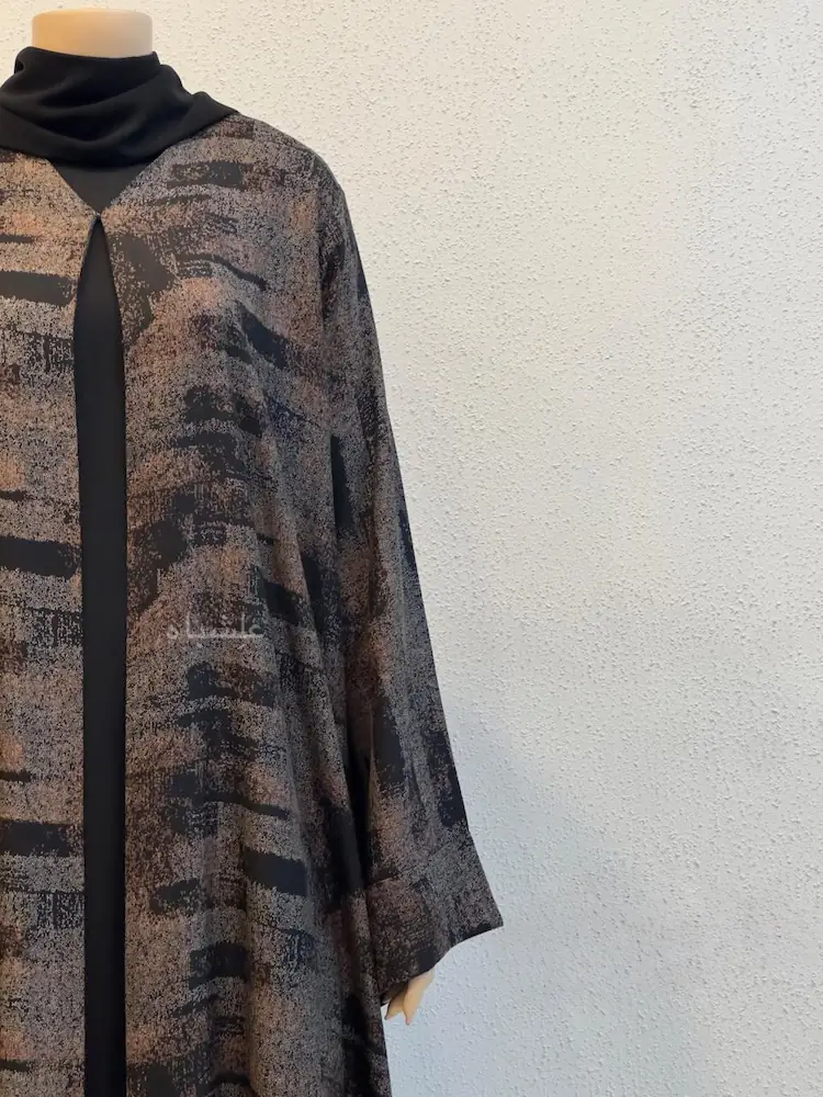This printed abaya-Whispered Geometry is built around a strong geometric identity โ textured brush-strokes layered in warm brown, deep black, and muted tones