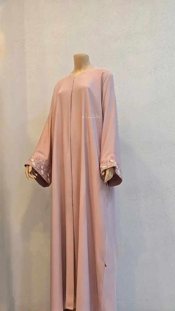 Rasha Blush โ€” a dusty rose abaya in Nida Premium fabric with hand-thread and bead detailing on sleeves and sheila. Soft, graceful, and crafted for quiet elegance.