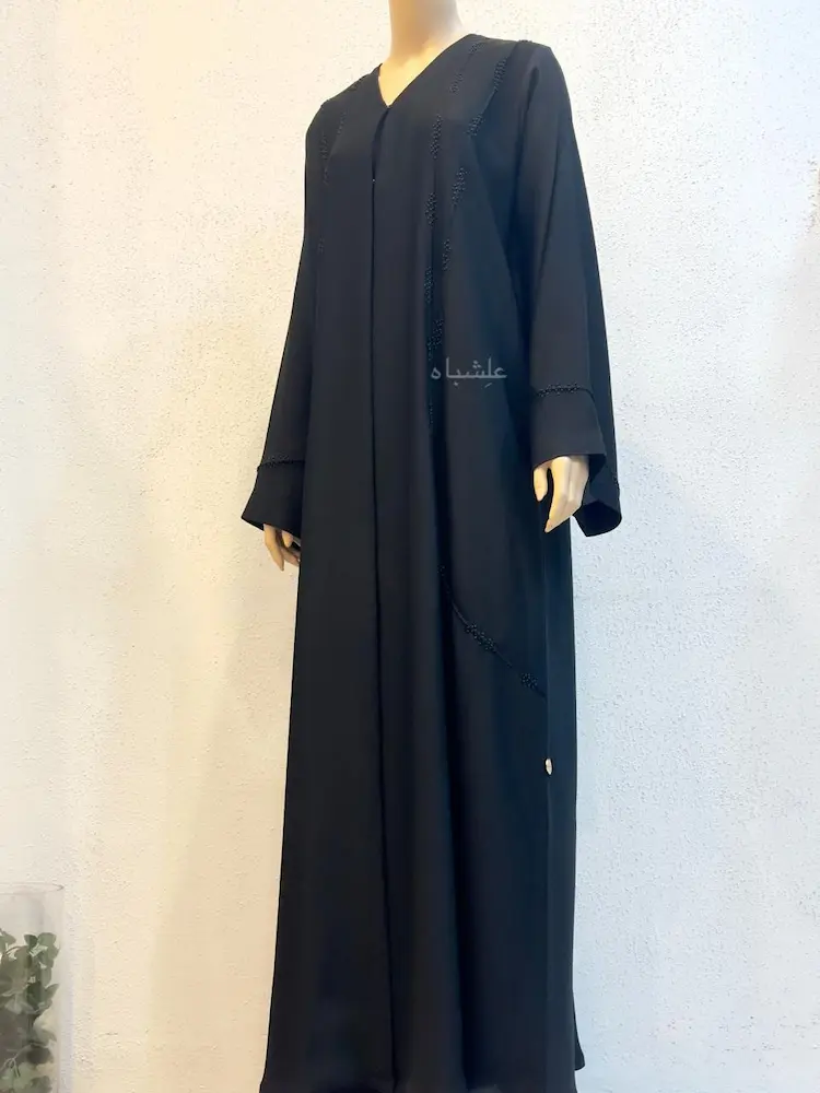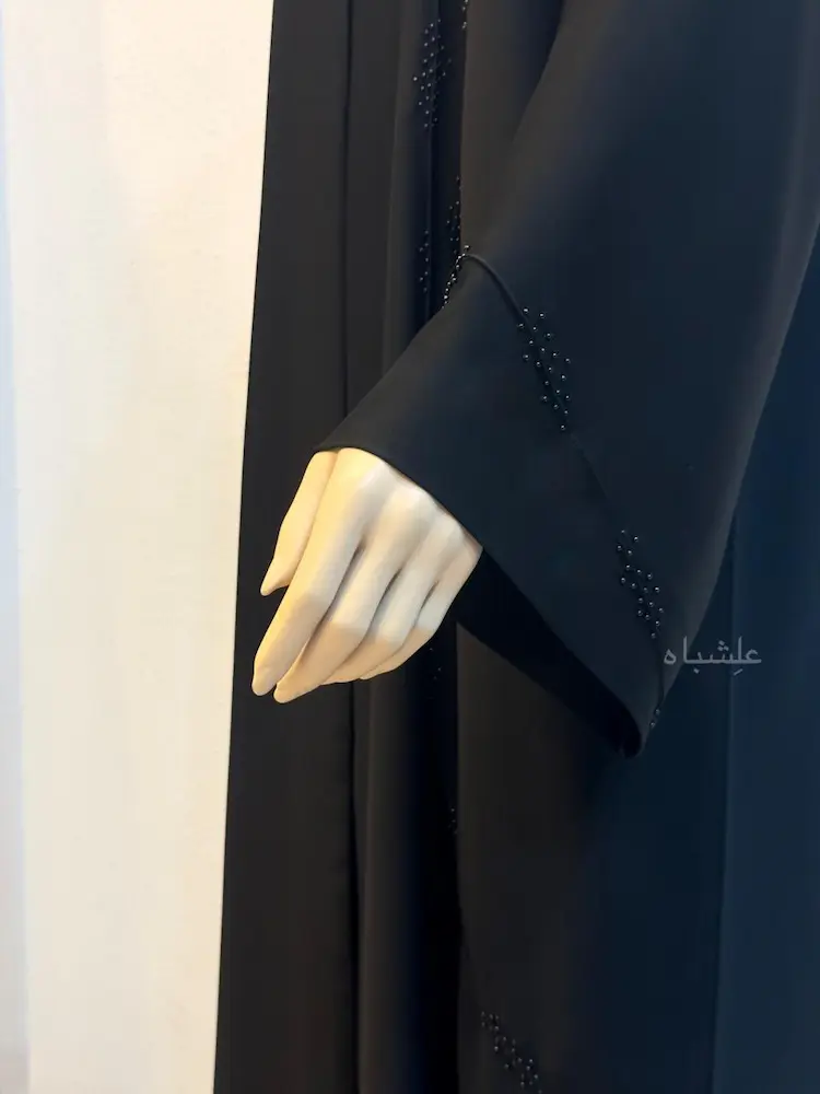 The bead work appears softly along the fabric, echoing the vertical rhythm of the abaya body