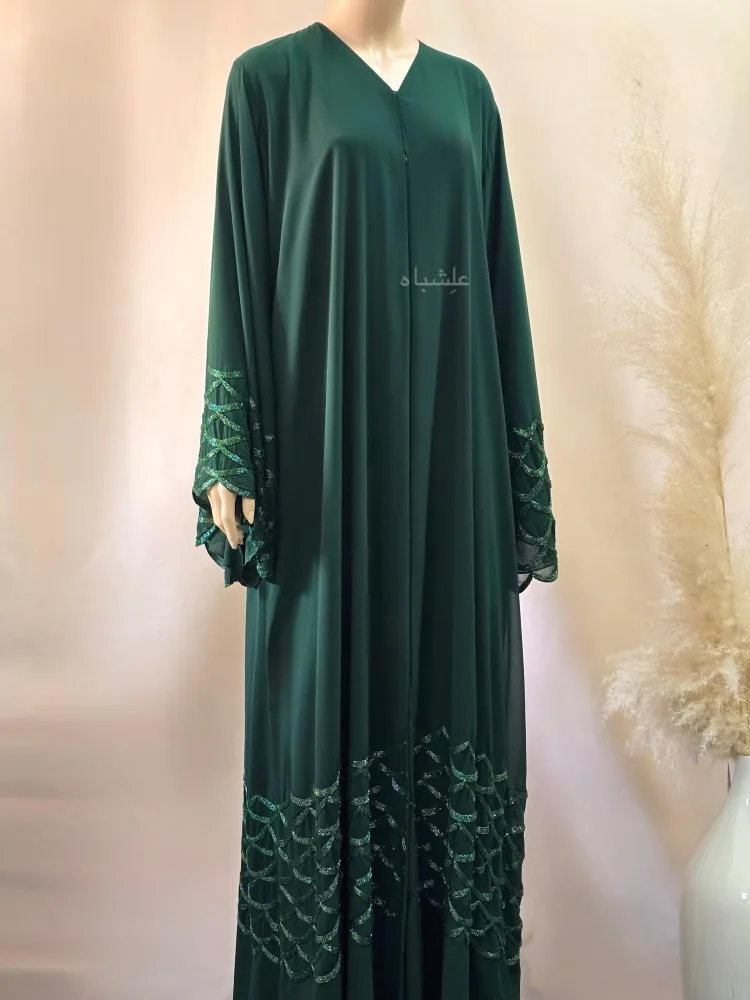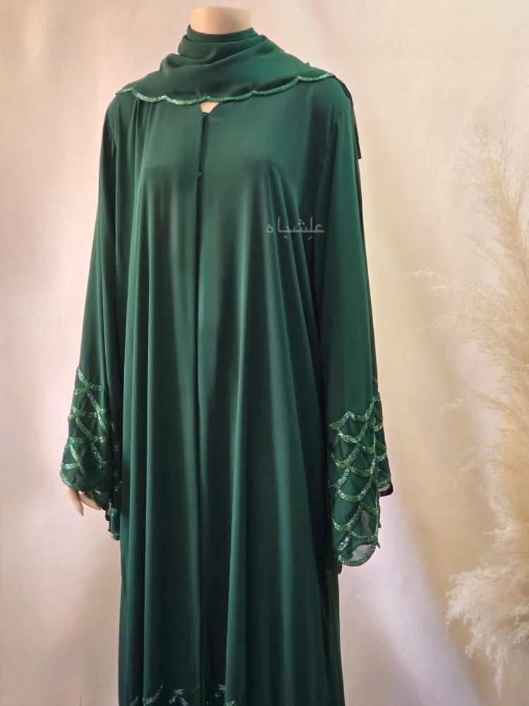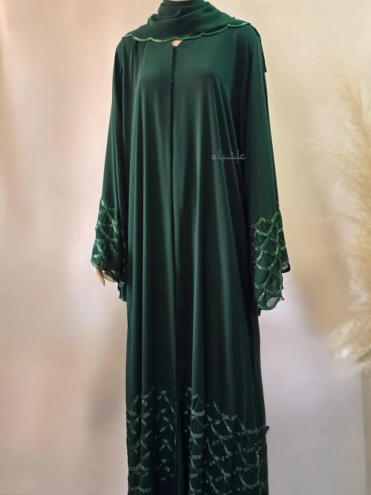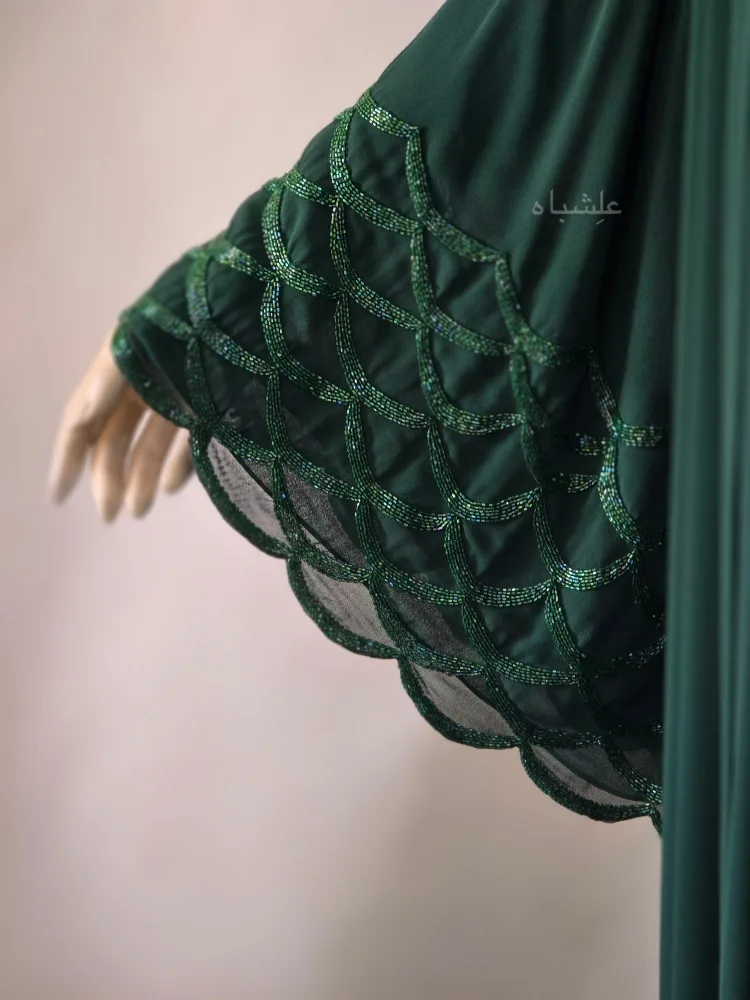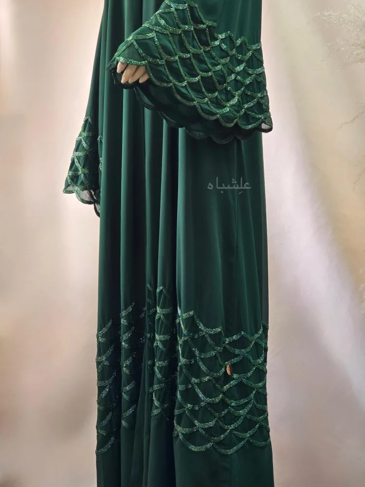 What makes this abaya different is the hand-finished scallop detailing. Each edge is treated with care. The shimmer added to these lines creates subtle highlights that move with light and motion. It’s a mark of time and effortโnot machine-made, not rushed.