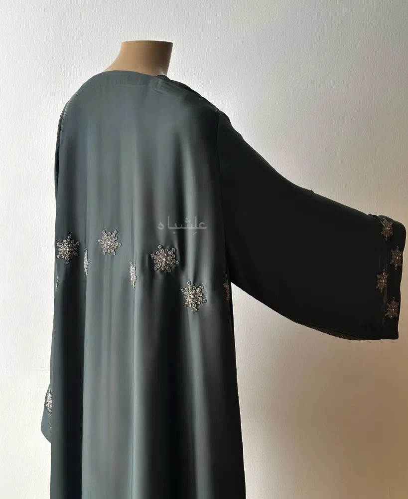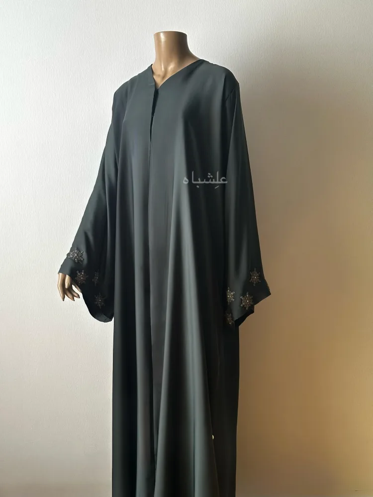 • Handwork: Golden hand-stitched floral accents scattered gracefully across the abaya.