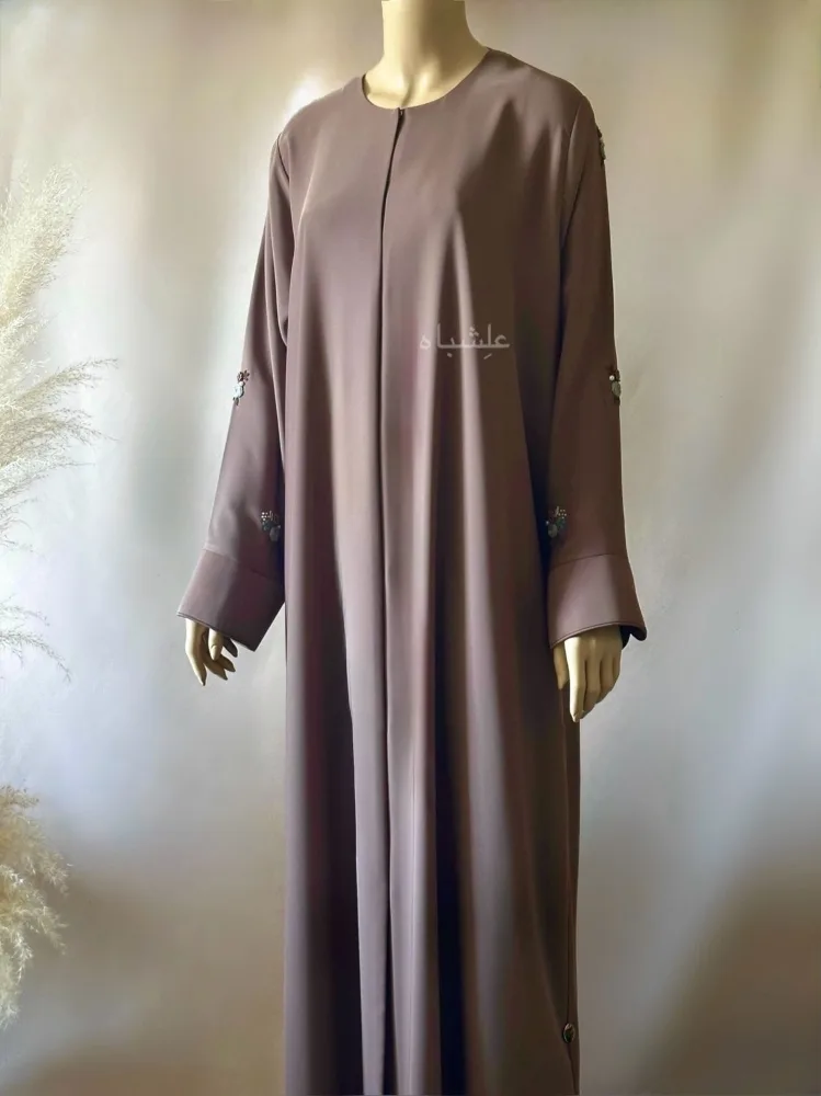 The hand-stitched floral and pearl work is placed only on both sleeves. The rest of the abaya features subtle motifs and piping.