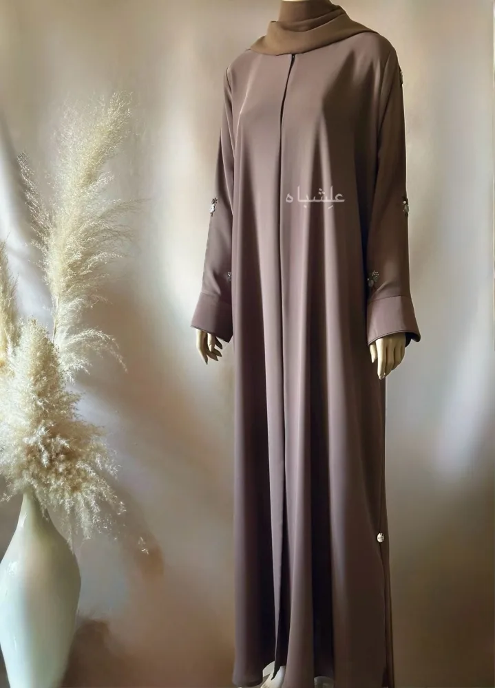 The handwork on the sleeves is done by hand, one piece at a time. Pearls and thread are placed with care, giving the sleeves a layered, soft texture that feels as good as it looks. The sheila matches beautifully, creating a complete abaya dress that requires no extra styling.