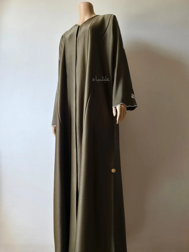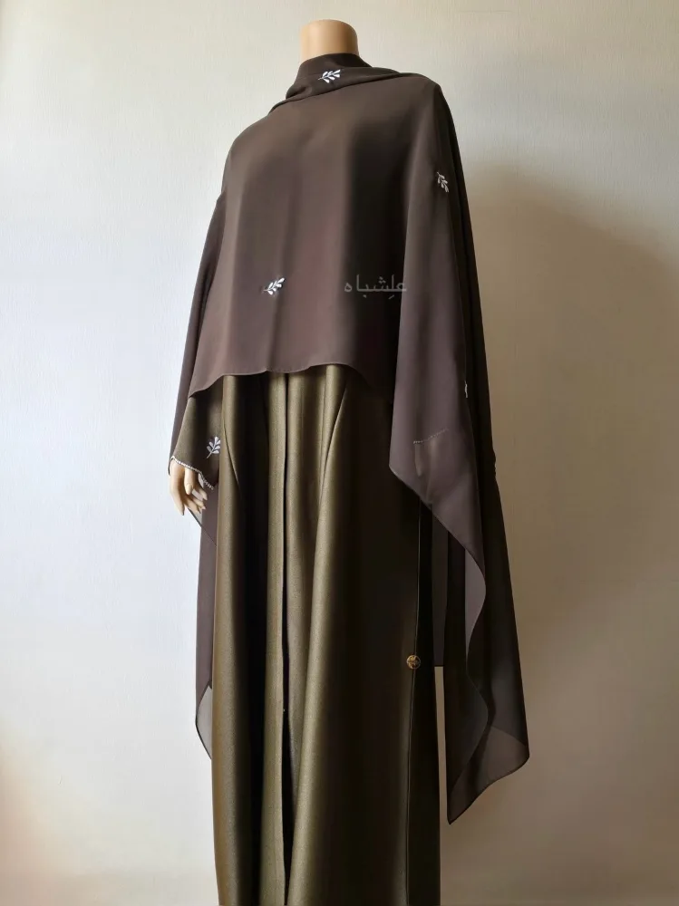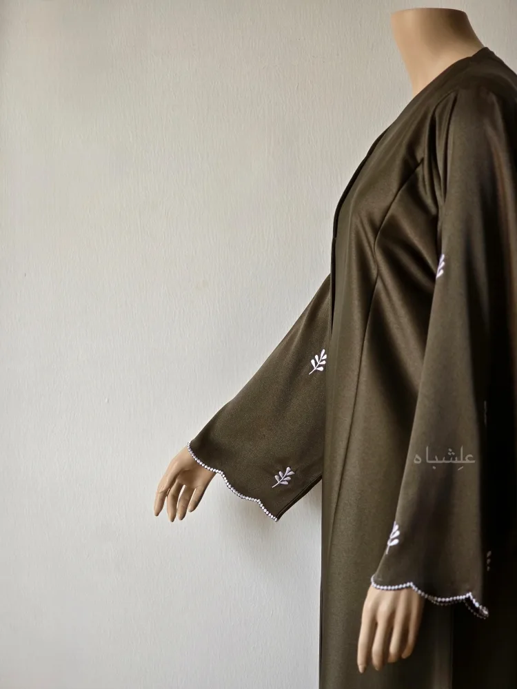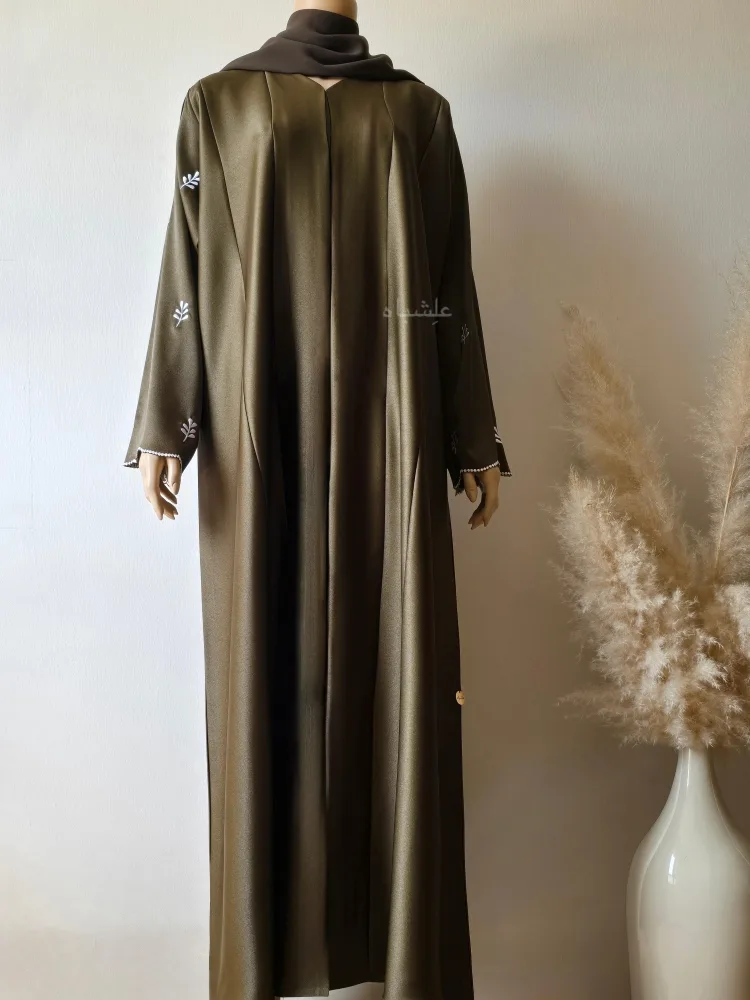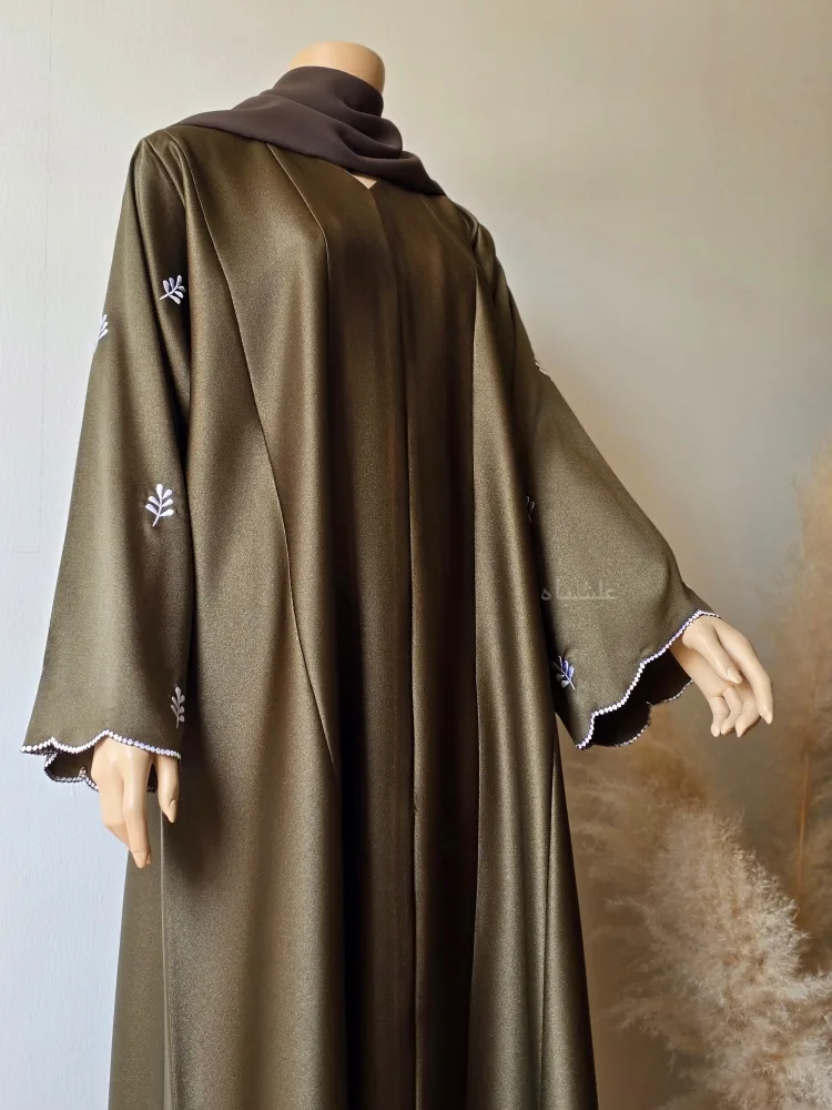 This high quality abaya is more than a garment. Itโs a feeling. The white leaf embroidery on the sleeves gives it a natural, fresh appeal. The soft chiffon sheila mirrors the same motif, creating a complete look that feels both intentional and soulful.